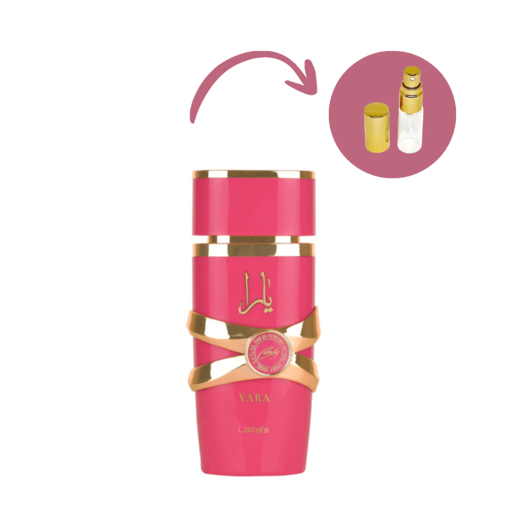 Yara Candy de Lattafa Perfumes é um perfume Floral Frutado Gourmet Feminino. Esta é uma nova fragrância. Yara Candy foi lançada em 2024. As notas de topo são: Groselha Preta e Tangerina Verde. As notas de coração são: Strawberry Fizz Candy e Gardênia. As notas de fundo são: Baunilha, Âmbar, Almíscar e Sândalo.